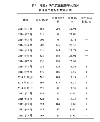1.發(fā)現(xiàn)氮?dú)獬瑯?biāo)。煉油部與計(jì)量中心于2014 年 7 月出臺(tái)聯(lián)動(dòng)流程后,出廠的液化石油氣車況改善很大,表 1 是煉油部出廠的液化石油氣在 2014 年 ~ 2015 年 5 月,每月的車輛皮重報(bào)警率統(tǒng)計(jì)和推出聯(lián)動(dòng)流程后當(dāng)月發(fā)現(xiàn)氮?dú)獬瑯?biāo)的批數(shù)統(tǒng)計(jì)。在這段時(shí)間裝運(yùn)液化石油氣的車輛共有 230余部,多為散戶。管控力度大時(shí),如 2015 年 5 月,標(biāo)準(zhǔn)皮重的維護(hù)權(quán)限由車間專人接管,共查到 17批氮?dú)獬瑯?biāo)車輛,當(dāng)月的皮重報(bào)警率最 低,為 6. 37% 。