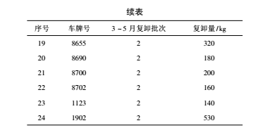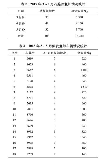 2.主輔比對(duì)數(shù)據(jù),復(fù)卸次數(shù)減少,虧損率下降。石腦油是天津石化采購(gòu)的大宗物料,物資裝備部委托某大型運(yùn)輸公司承運(yùn)。我們的卸凈控制指標(biāo)是,當(dāng)供方磅單凈重大于我方凈重 90 kg時(shí),要求司機(jī)回卸車棧臺(tái)復(fù)卸。因棧臺(tái)的卸料泵功率較低,并且較陳舊,卸料速度較慢,且因棧臺(tái)人員顧慮泵空轉(zhuǎn),損傷泵體,造成卸料不凈,這是客觀原因。還有主觀原因,部分車輛幾次三番發(fā)生復(fù)卸現(xiàn)象,并能卸出超過(guò) 60 kg 的油料,有故意不卸凈傾向。這些情況承運(yùn)公司并不知曉。我們通過(guò)統(tǒng)計(jì)比對(duì)數(shù)據(jù),統(tǒng)計(jì)頻發(fā)復(fù)卸車輛的情況 ( 見表 2 和表 3) ,通報(bào)并敦促運(yùn)輸公司管理層,加強(qiáng)對(duì)承運(yùn)司機(jī)的管理和考核,使司機(jī)自覺(jué)卸凈。