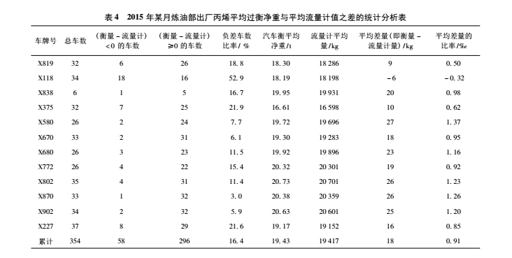 3.從數(shù)據(jù)比對(duì)發(fā)現(xiàn)異常車輛。由于丙烯易氣化,造成用流量計(jì)定量裝車有困難。流量計(jì)讀數(shù)普遍比地磅低,大約每車差幾十 kg,所以丙烯目前采用地磅結(jié)算。但流量計(jì)數(shù)可作為我們的又一雙眼睛,從兩個(gè)器具的對(duì)比量,我們可以發(fā)現(xiàn)異常車輛。表 4 是 2015 年某月煉油部出廠丙烯平均過(guò)衡凈重與平均流量計(jì)值之差的統(tǒng)計(jì)分析表。