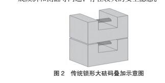 目前廣泛應用的動態軸重地磅的承載臺尺寸般為長(3.2 m) X寬(0.8 m),超寬車道為長(4.0 m) X寬(0.8 m),承載臺面積約為2.56 m2和3.2 m2。 而在靜態加載稱量試驗時,通常采用傳統1 t的鎖形大砝碼,其尺寸約為:長(0.8 m)x寬(0.6 m)x 高(0.52 m),底面積為0.48 m2 (圖2)。在砝碼進行 加、卸載過程中,往往會受限于砝碼自身高度和底 面積的因素,較難控制加載的高度和實現最大量程 的加載,且當砝碼疊加過程中若重心不穩,極易造 成傾斜和側翻等問題,存在較大的安全隱患。